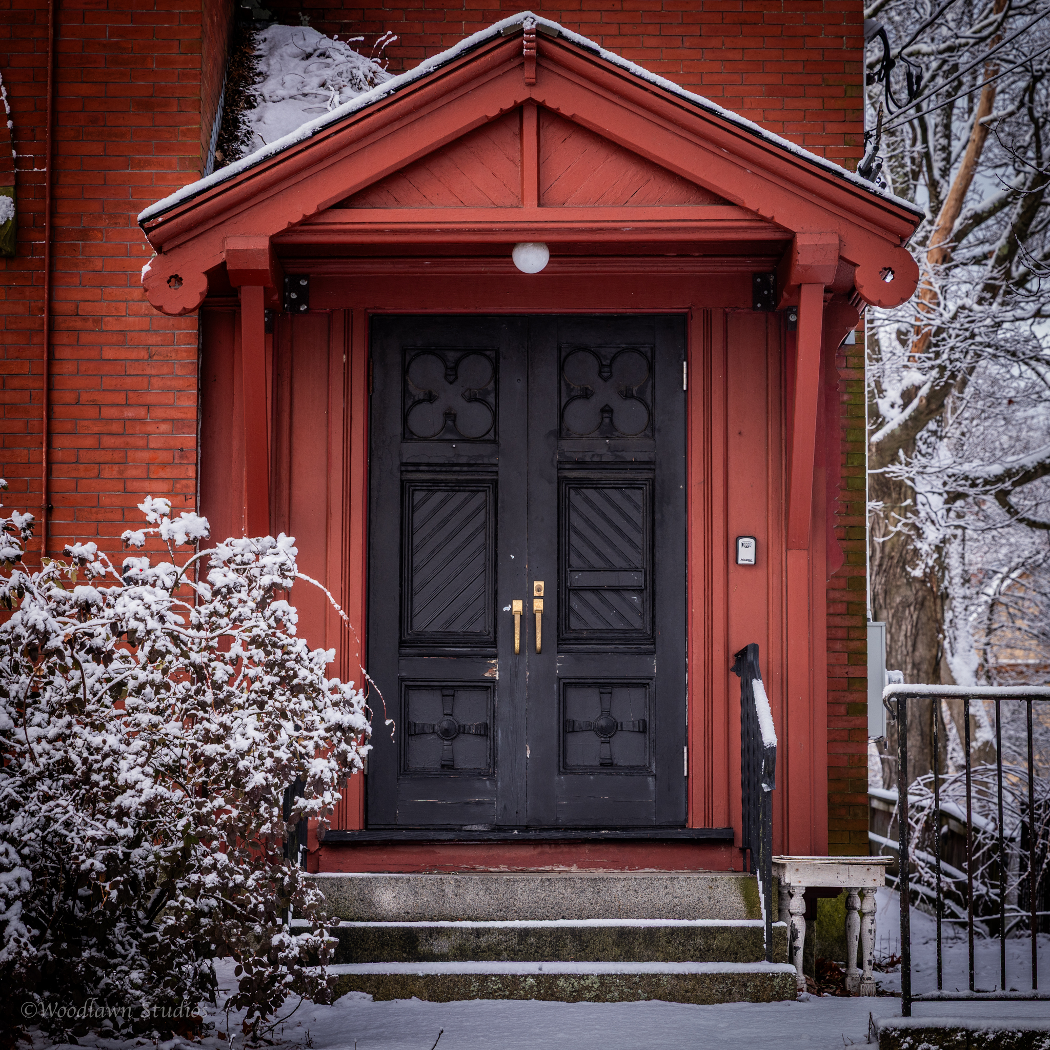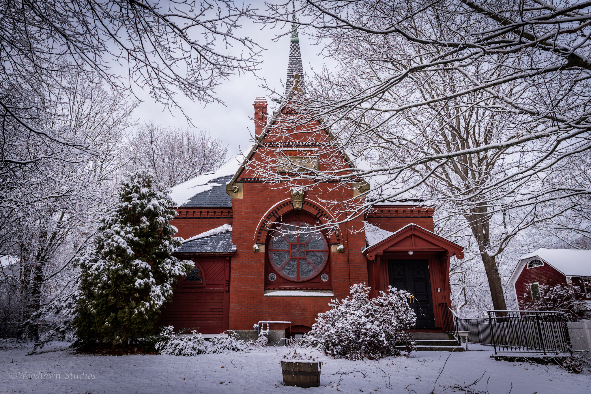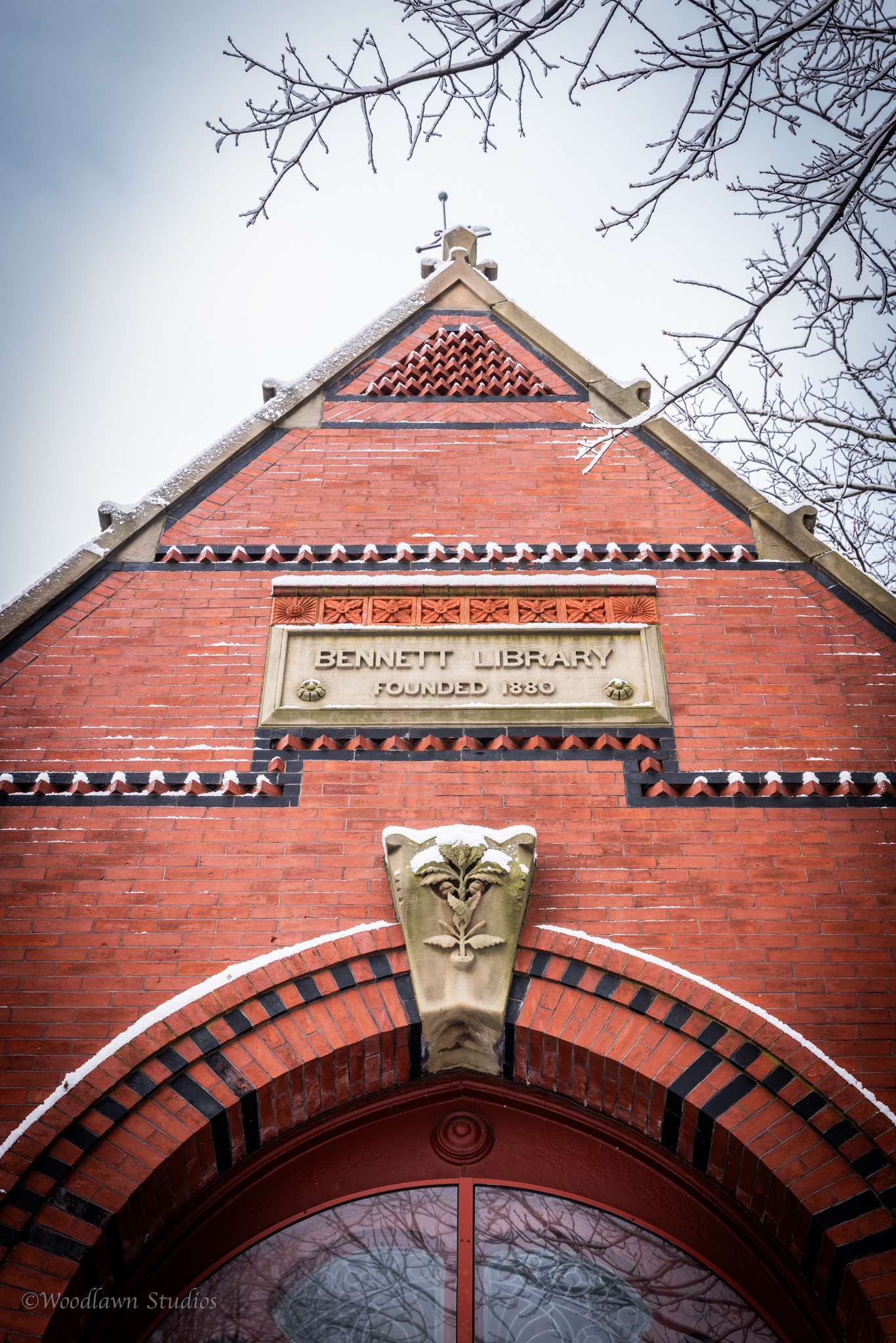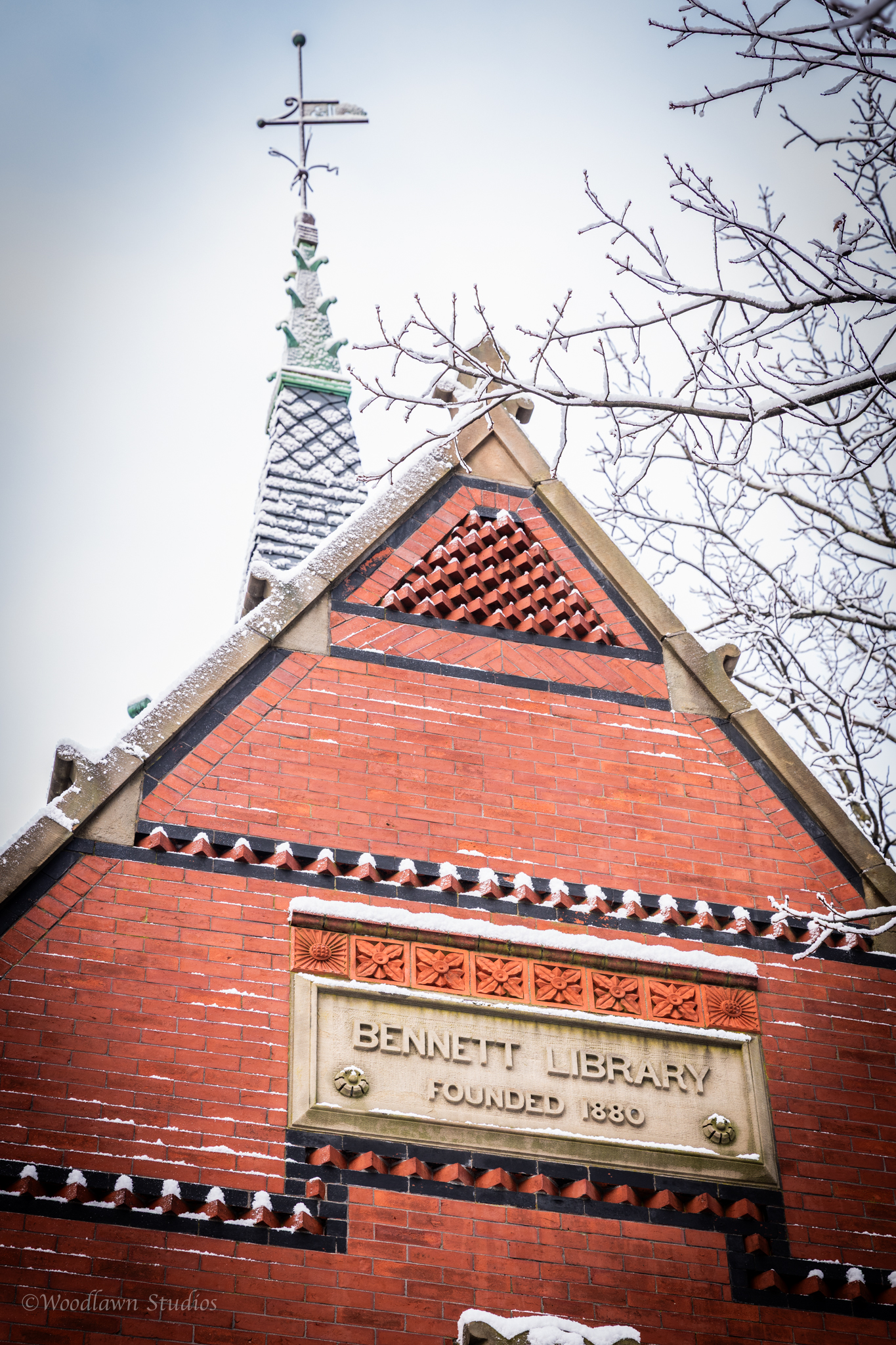 A few steps away stood the Bennett Library — one of my favorite buildings to photograph in town. There’s something about red brick under snow that feels nostalgic, almost cinematic. The library’s strong lines and vintage carvings contrasted beautifully with the delicate dusting of frost along its roof and windows.