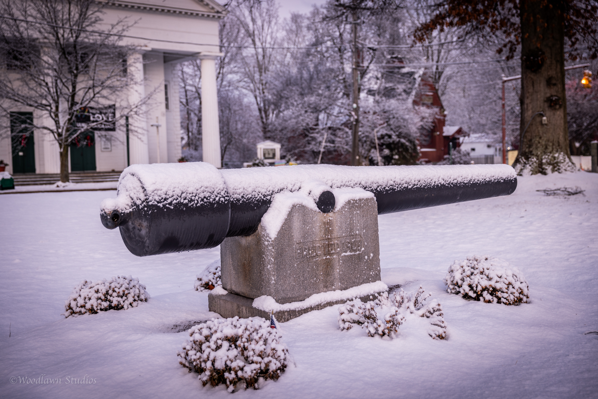 My first stop was the Billerica Town Common. The Civil War monument stood tall, dignified against the soft pink sunrise. A gentle layer of snow balanced delicately on the cannon and atop the soldier’s cap. Behind him, bare trees traced filigree patterns into the sky, their branches caught in the glow of the early morning light.