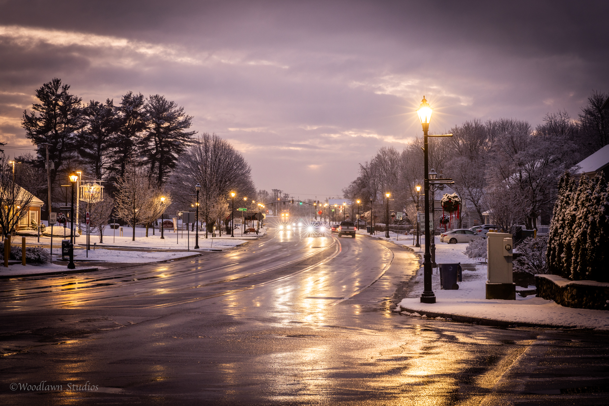 As I turned to leave, I paused for one final wide shot looking down Boston Road. The streetlamps were still glowing, their golden light catching the damp pavement and snow-covered sidewalks. A few tire tracks glistened in the morning light. You could feel the day beginning, but gently. No rush yet.